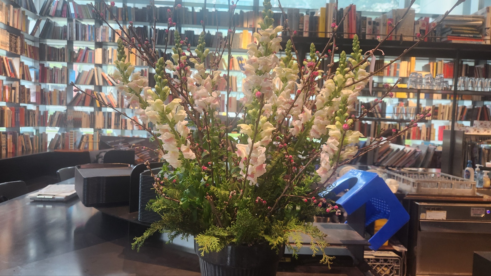 책과 꽃은 카페에 잘 어울리는 단짝이에요