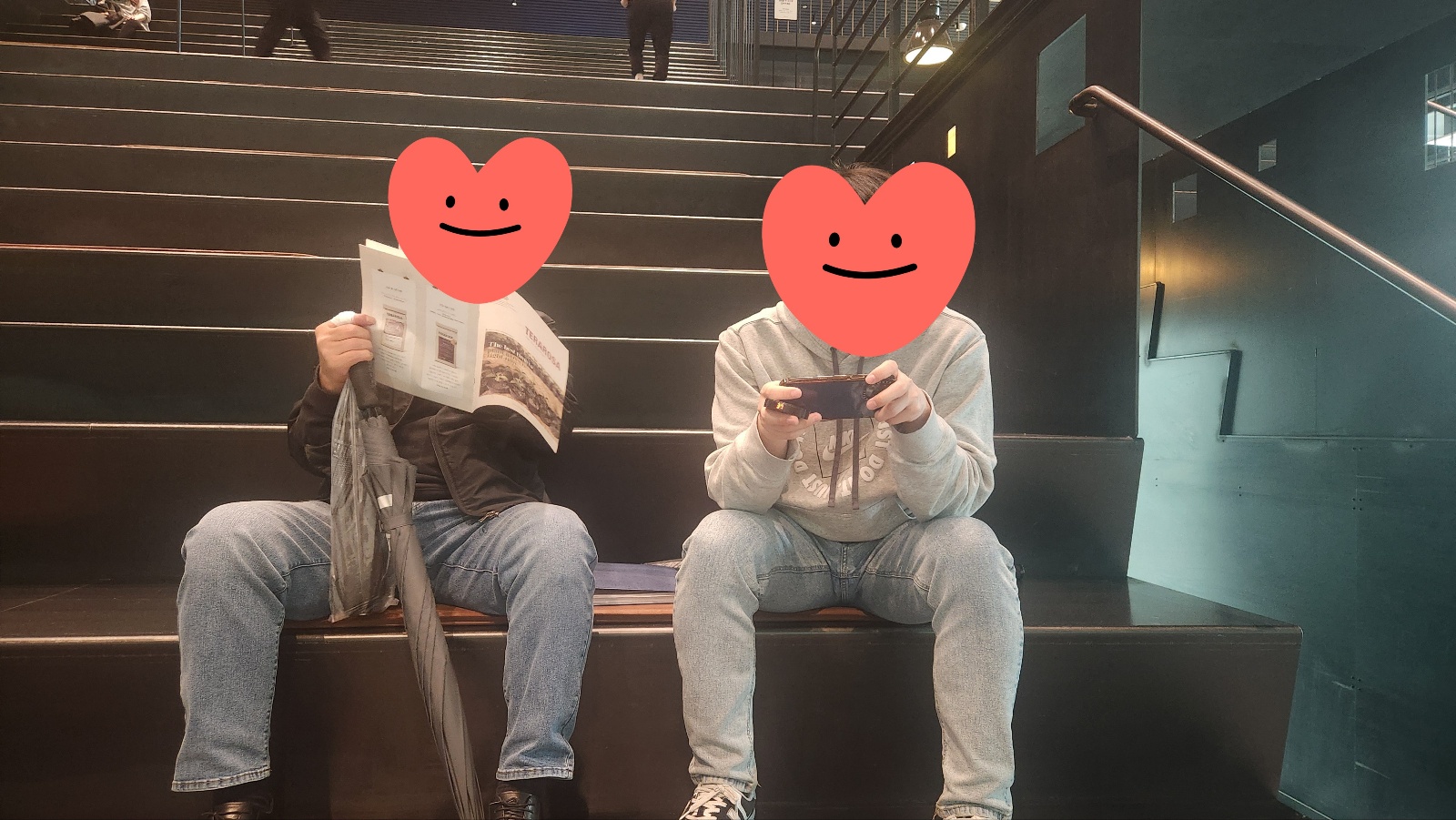핸드폰과 신문을 읽느라 각자 일을 보고 있네요