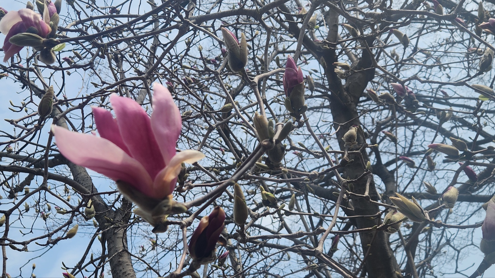 자색 목련은 지금 한참 꽃봉오리로 열려가는 중인가 봐요