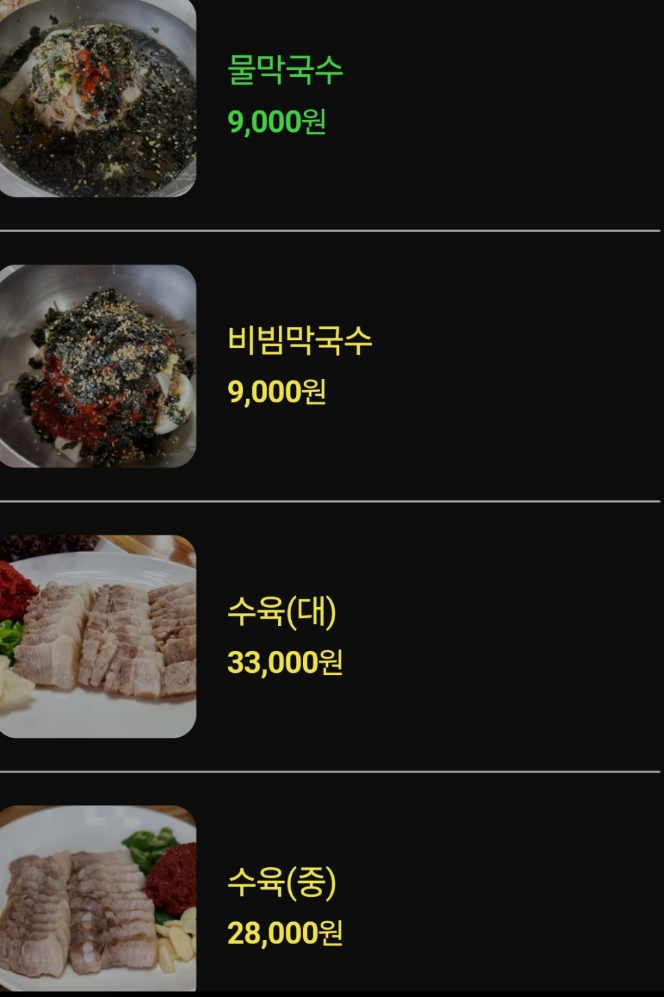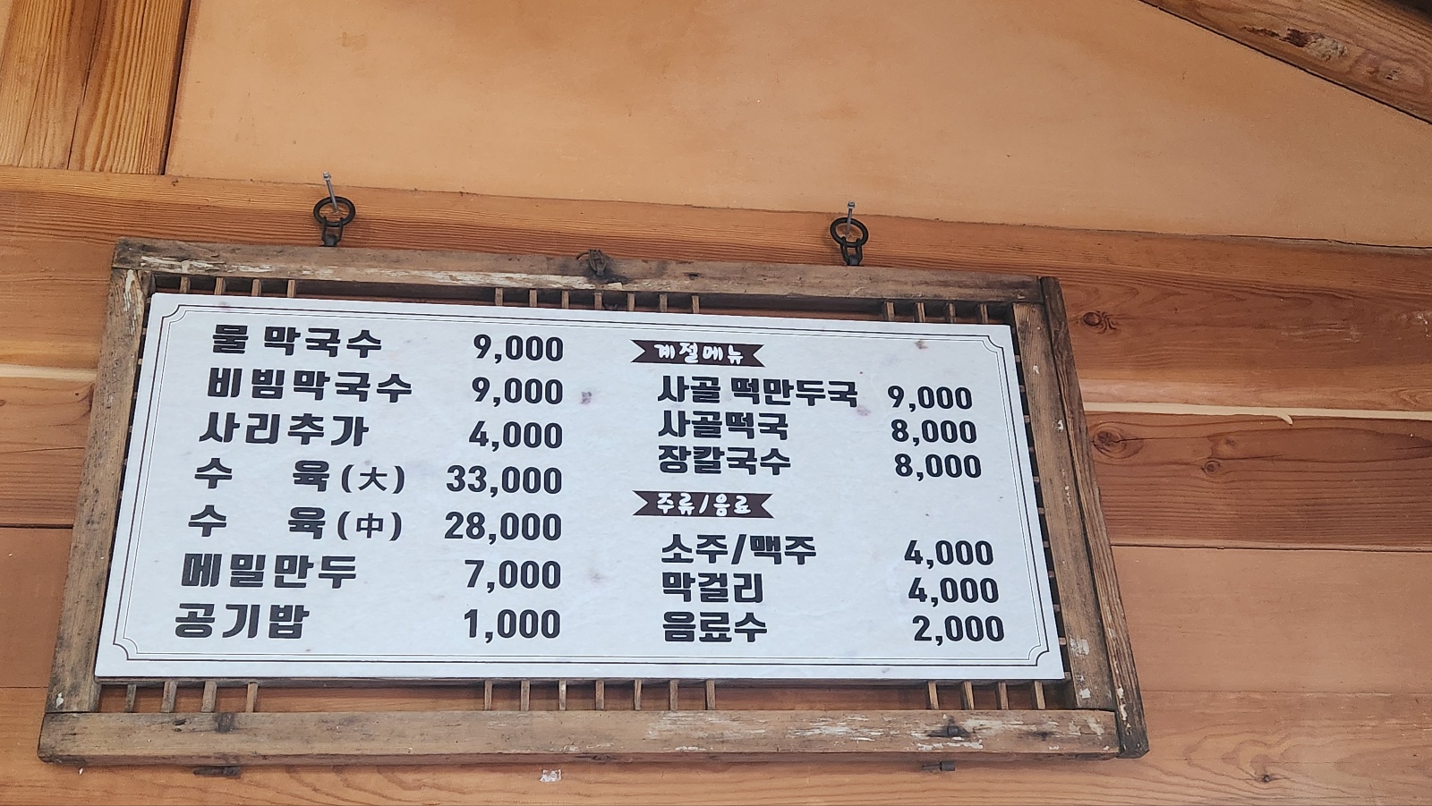 가곡 막국수 메뉴판인데