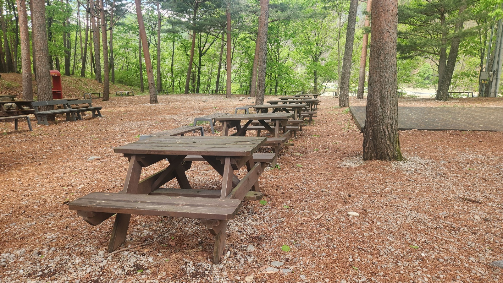 식후에 자판기 커피 한잔 들고 마당 한가운데 나무 테이블에 앉아