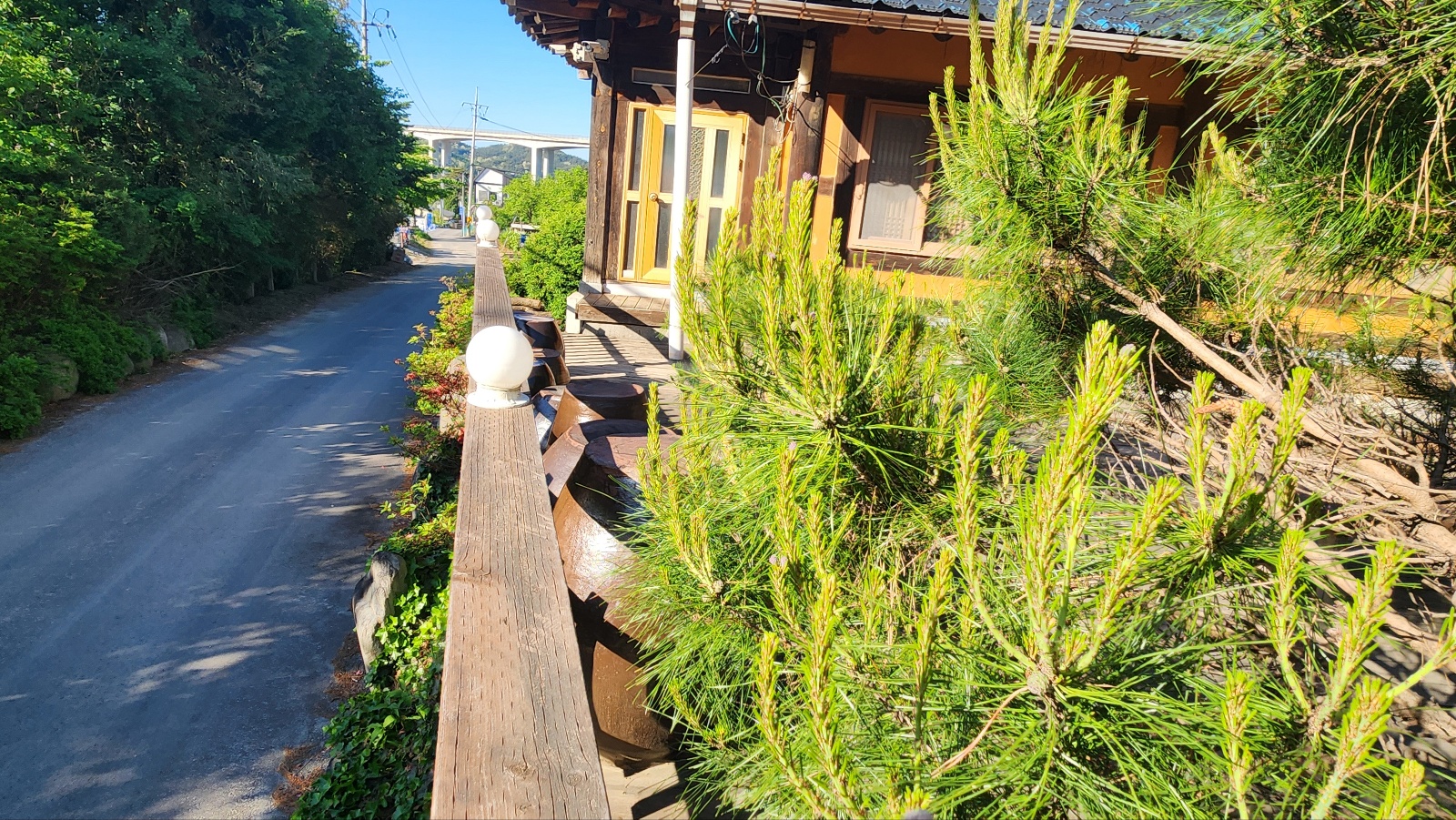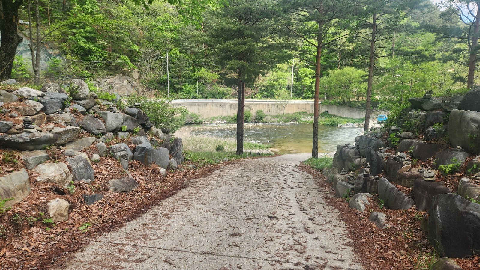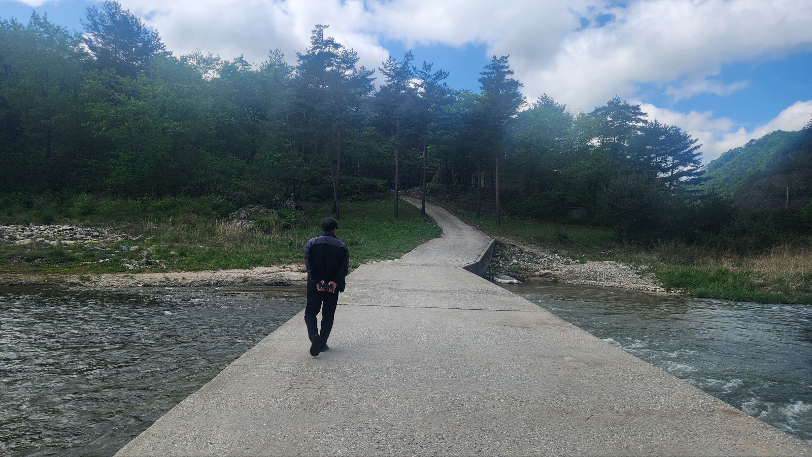 길게 뻗은 개울가 다리를 건너본다