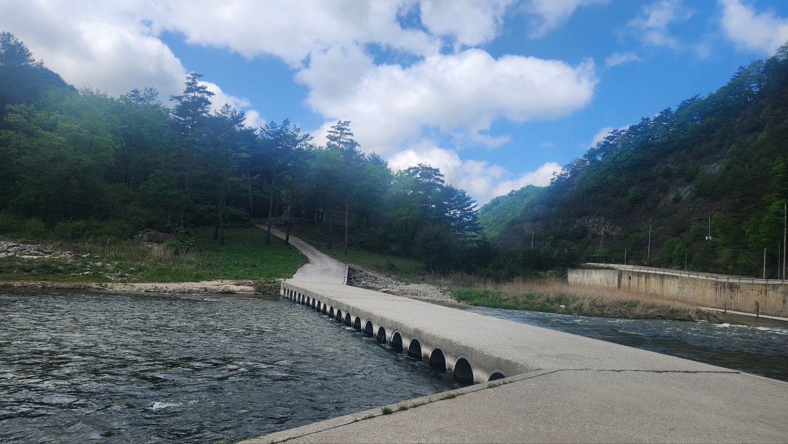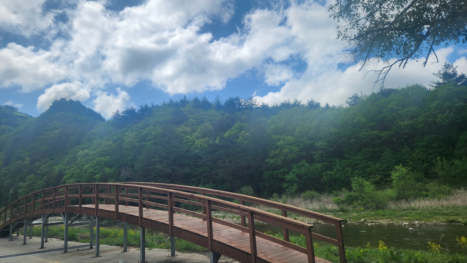 하얀 구름 아래 멋진 구름다리밑으로 흐르는 물줄기는 시원스럽다