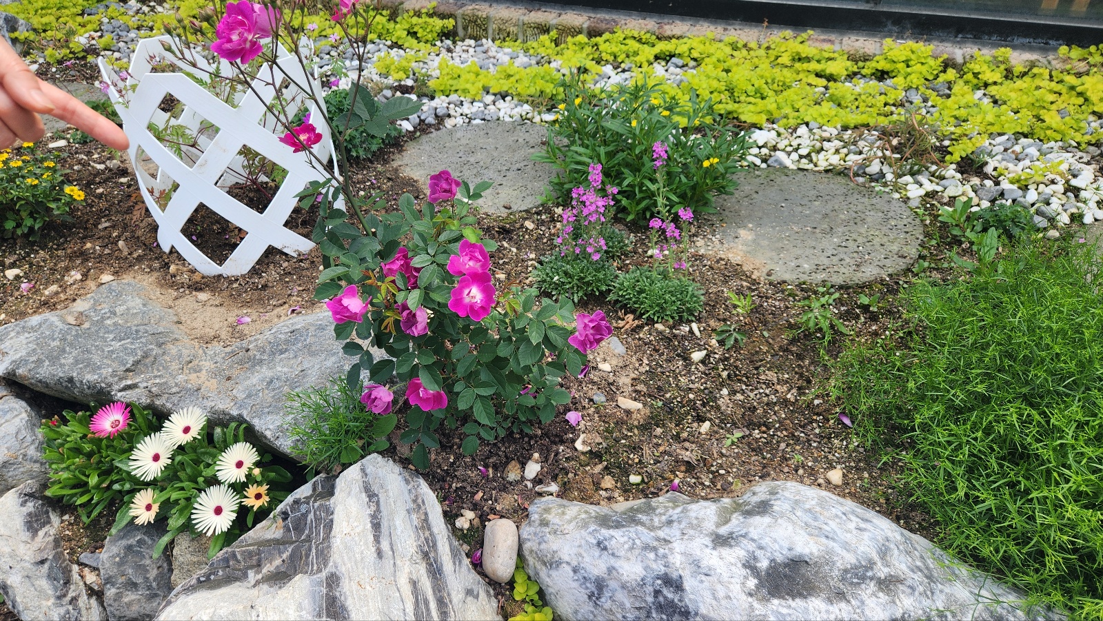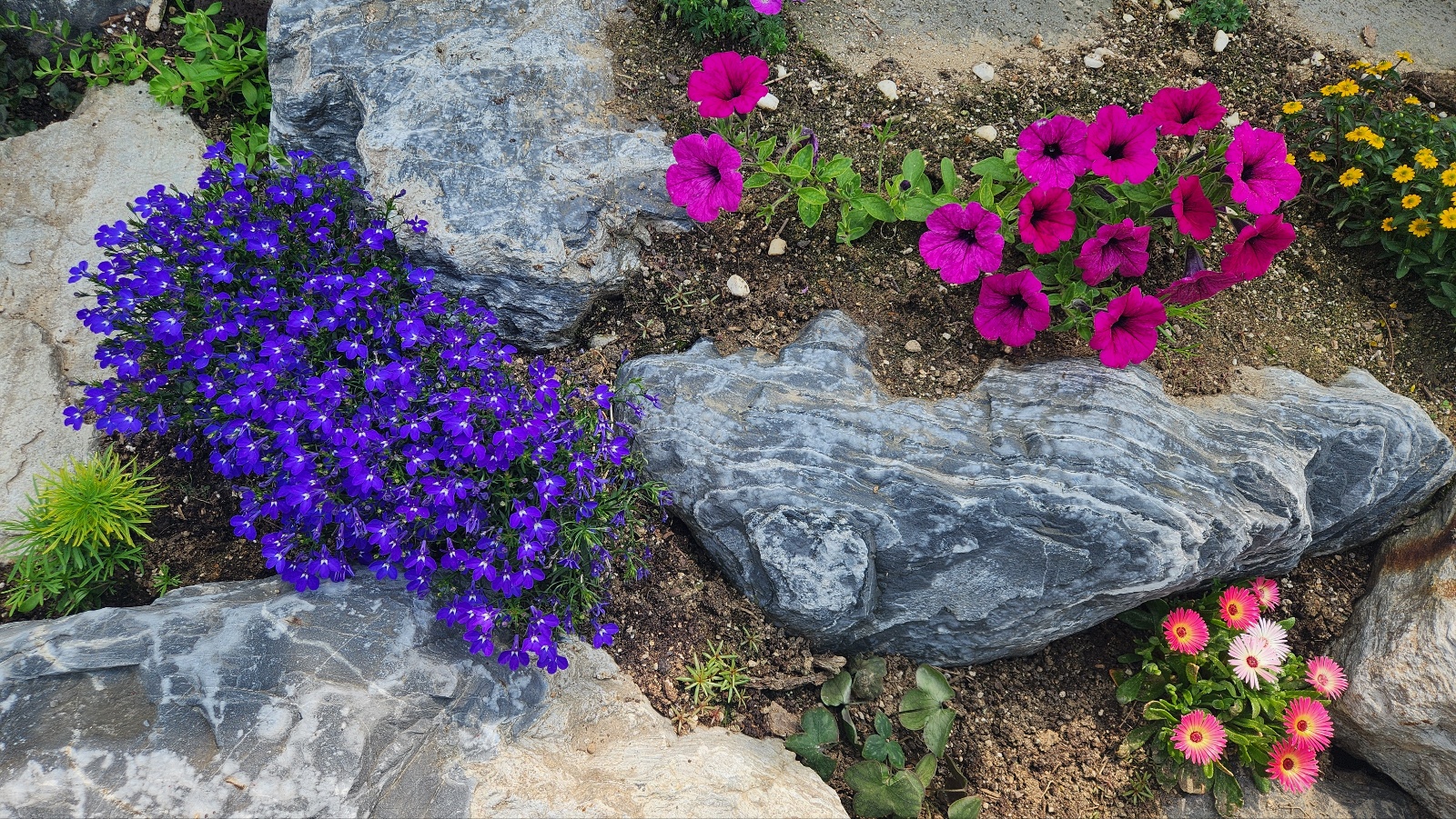백단 선인장과 보라색 로벨리아, 그리고 서피니아 와 리빙스턴 데이지