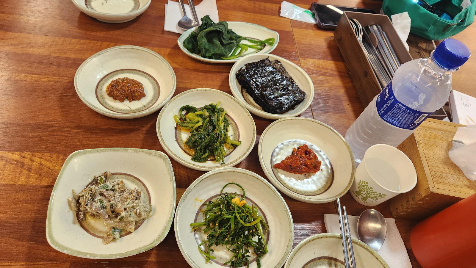 곱창김, 무말랭이, 미나리 무침, 씨알젓갈, 강화새우볶음, 마늘종, 열무김치 ,묵무침,